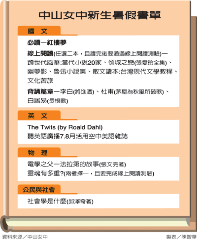 配合開學要上課的內容,台北市中山女中在寒暑假會針對各年級不同的需求,開閱讀書單,今年也不例外,不少科目都有書單,其中以國文科最多,分成必讀書目、線上閱讀、背誦篇章等,必讀的是小說「紅樓夢」,已被列為新生必讀書目多年。
